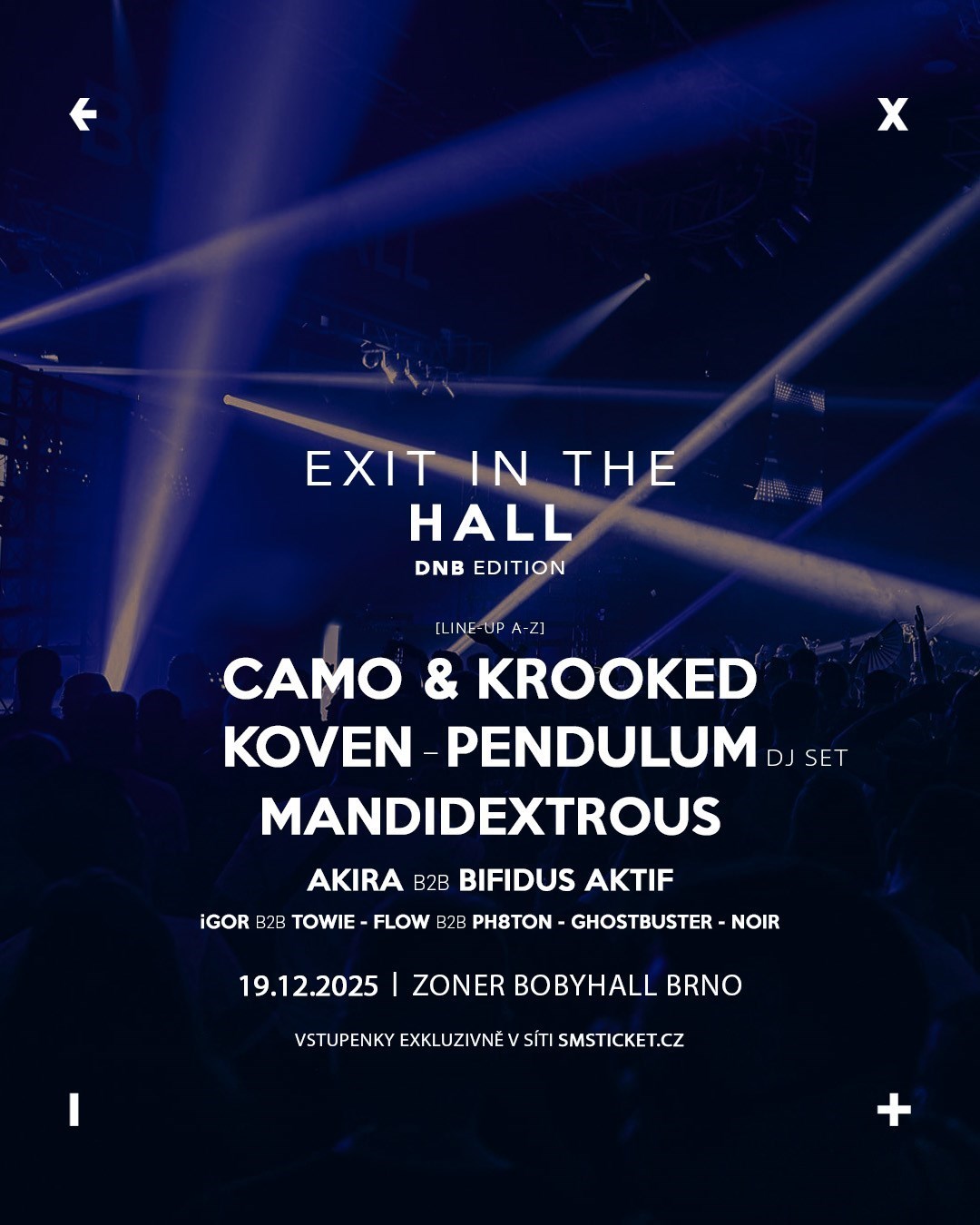 DnB edice EXIT In The Hall se vrací 19.12. v plné síle do Zoner Boby Hall! 🔥 Tentokrát pozvání přijali legendární 𝐏𝐞𝐧𝐝𝐮𝐥𝐮𝐦 (DJ set) z Austrálie, rakouští velikáni 𝐂𝐚𝐦𝐨 & 𝐊𝐫𝐨𝐨𝐤𝐞𝐝 a z Anglie 𝐊𝐨𝐯𝐞𝐧 s 𝐌𝐚𝐧𝐝𝐢𝐝𝐞𝐱𝐭𝐫𝐨𝐮𝐬!☝