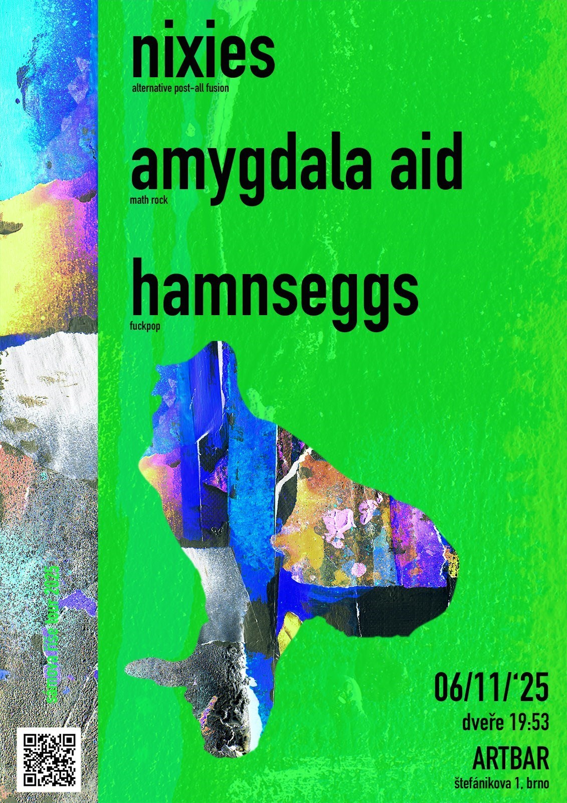 Mladá indie formace NIXIES oceněná berlínsko-českou porotou na festivalu Riversound 2025 dorazí do Brna, aby zde přes klubové repráky ARTBARu vypálila alternativní směs psychedelického rocku, kratrockových postupů, jazzového fusion a retro 80's synth popu. Dvojkoncert proběhne s domácí partičkou AMYGDALA AID, jejíž math rock rozvlní trupy, ruce i nohy a zaručeně nebude reálné počítat, jestli taneční krok vpřed byl na první dobu. Hudební akce pro (ne)společenské tvory, co vyznávají, že už i čtvrtek může být malou sobotou!
